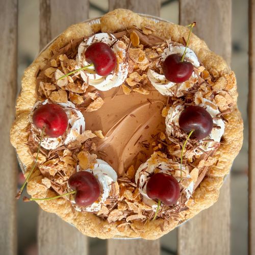 - 🍒🌰Black Forest Cherry Almond Pie: A layer of dark chocolate ganache topped with local Michigan sweet cherry compote with almond liquor, dark chocolate mousse, candied almonds, fresh whipped cream, chocolate shavings, and fresh cherries... all inside our signature all-butter pie crust.