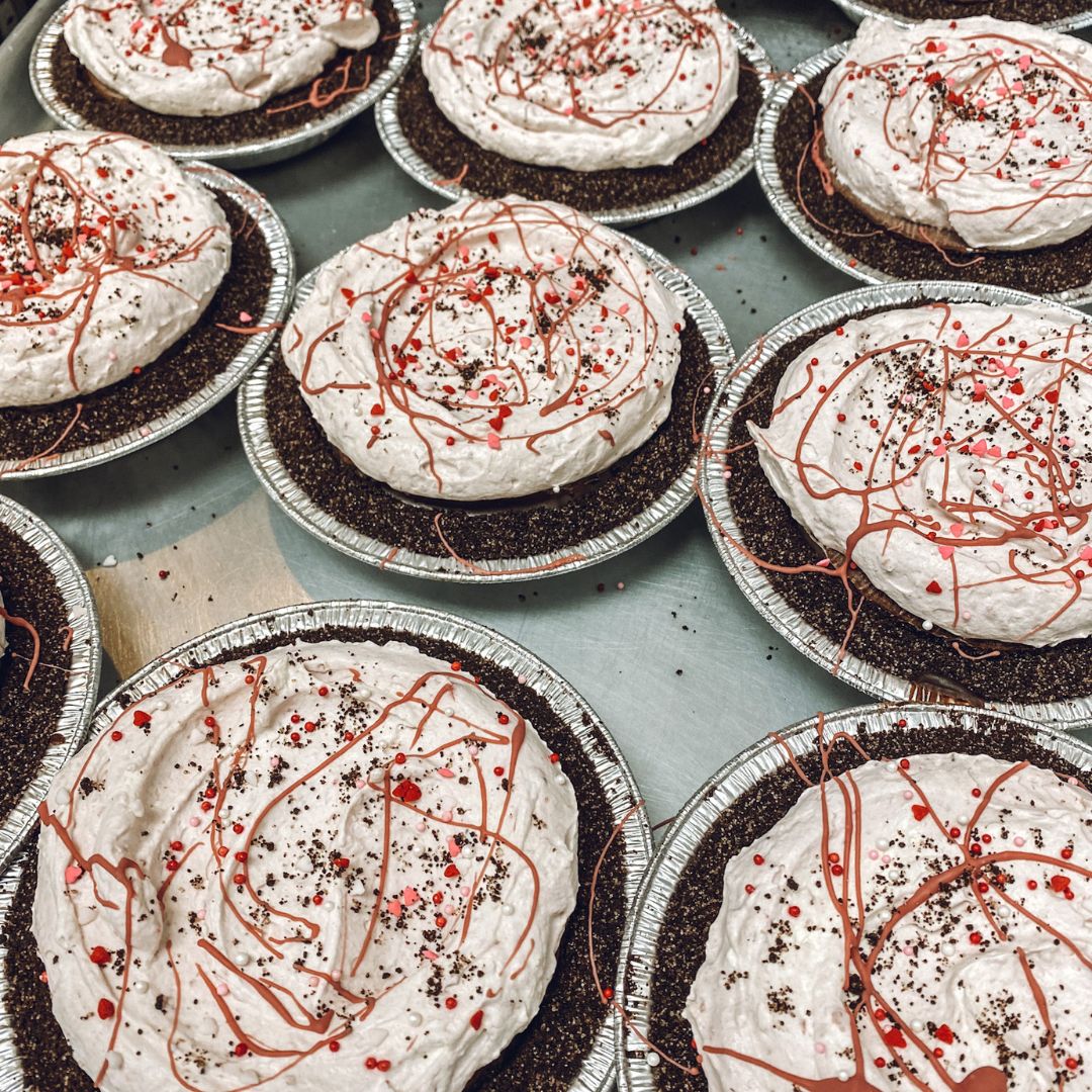 - 🍓🍫 Strawberry Chocolate Cream Pie: Our classic chocolate cream pie with a Valentine's twist! Topped with Strawberry-kissed whip cream, cookie crumbles, & Valentine-themed sprinkles (Available in regular and mini size!)