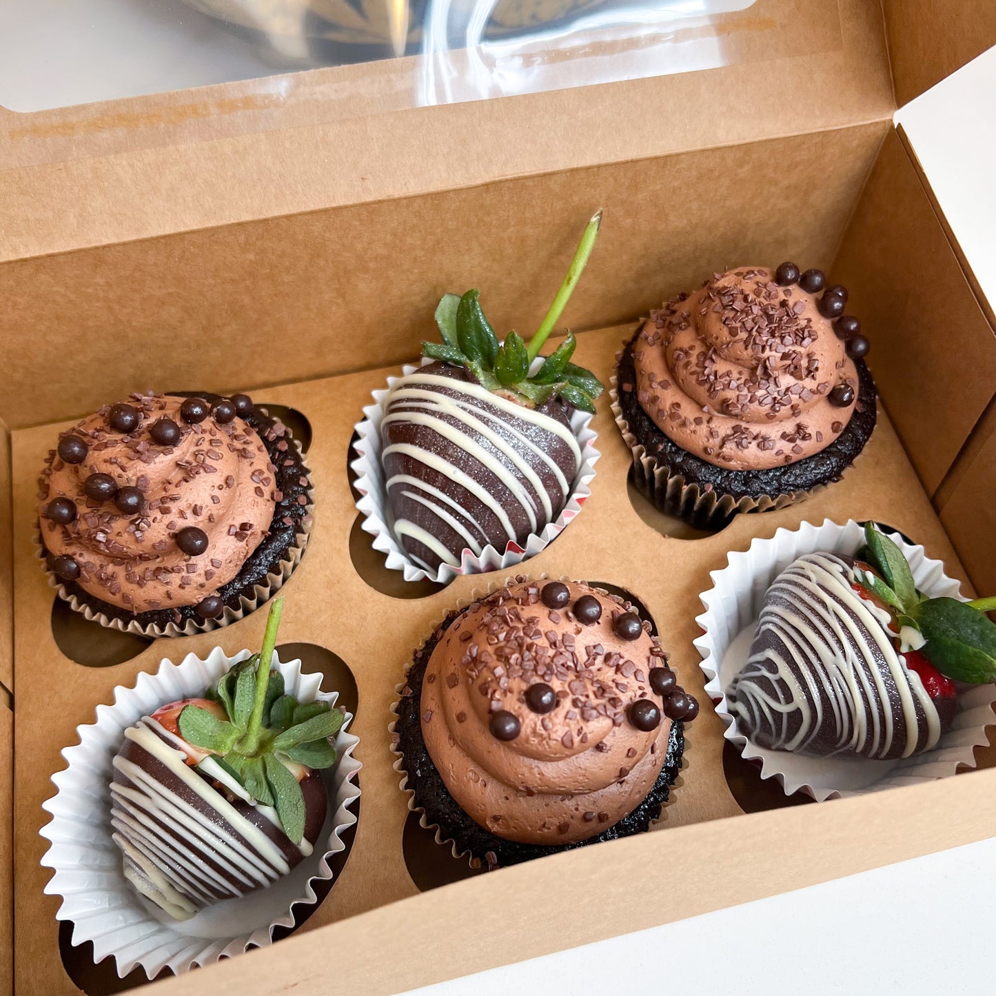 - 🍓 Cupcakes & Chocolate-Covered Strawberries: Perfect for gifting or enjoying with loved ones! Each box includes 3 dark chocolate cupcakes with chocolate buttercream icing and 3 chocolate covered strawberries (half-dozen treats per box total)